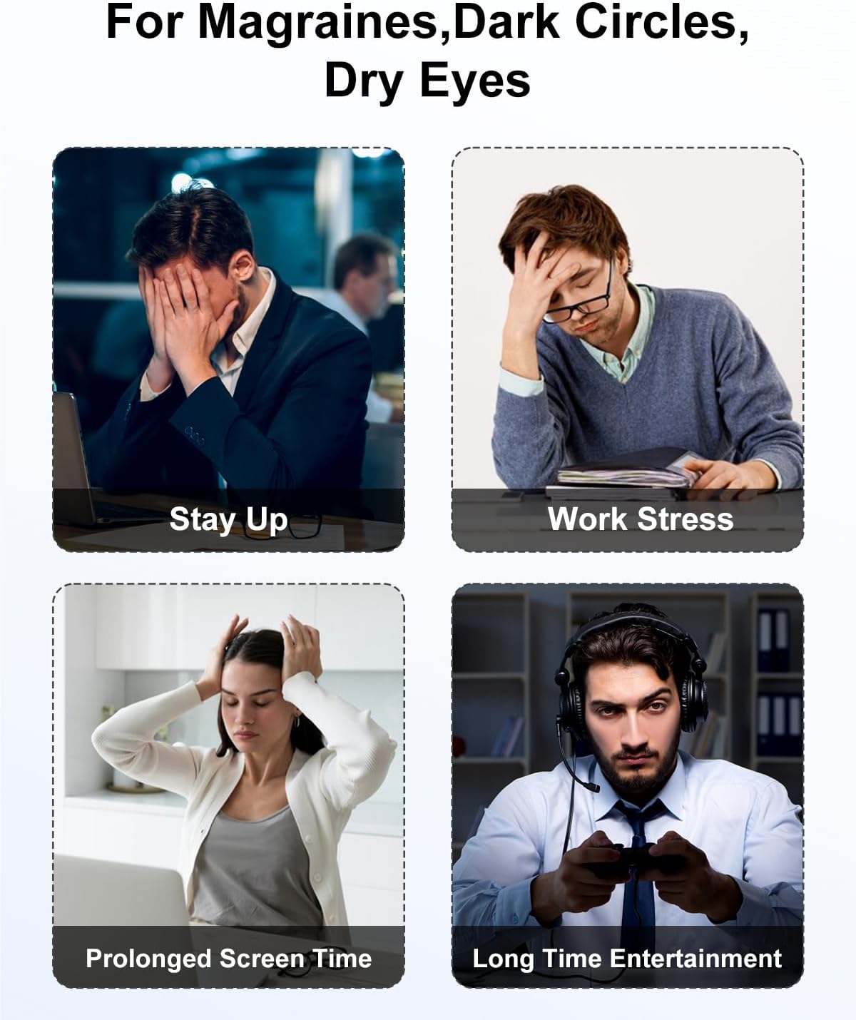 - Smart Multi-Mode Relief: Choose from 4 customized massage programs combining air compression, gentle vibrations, and heat therapy to target eye fatigue. Features auto-shutoff after 15 minutes for worry-free relaxation and enhanced safety.