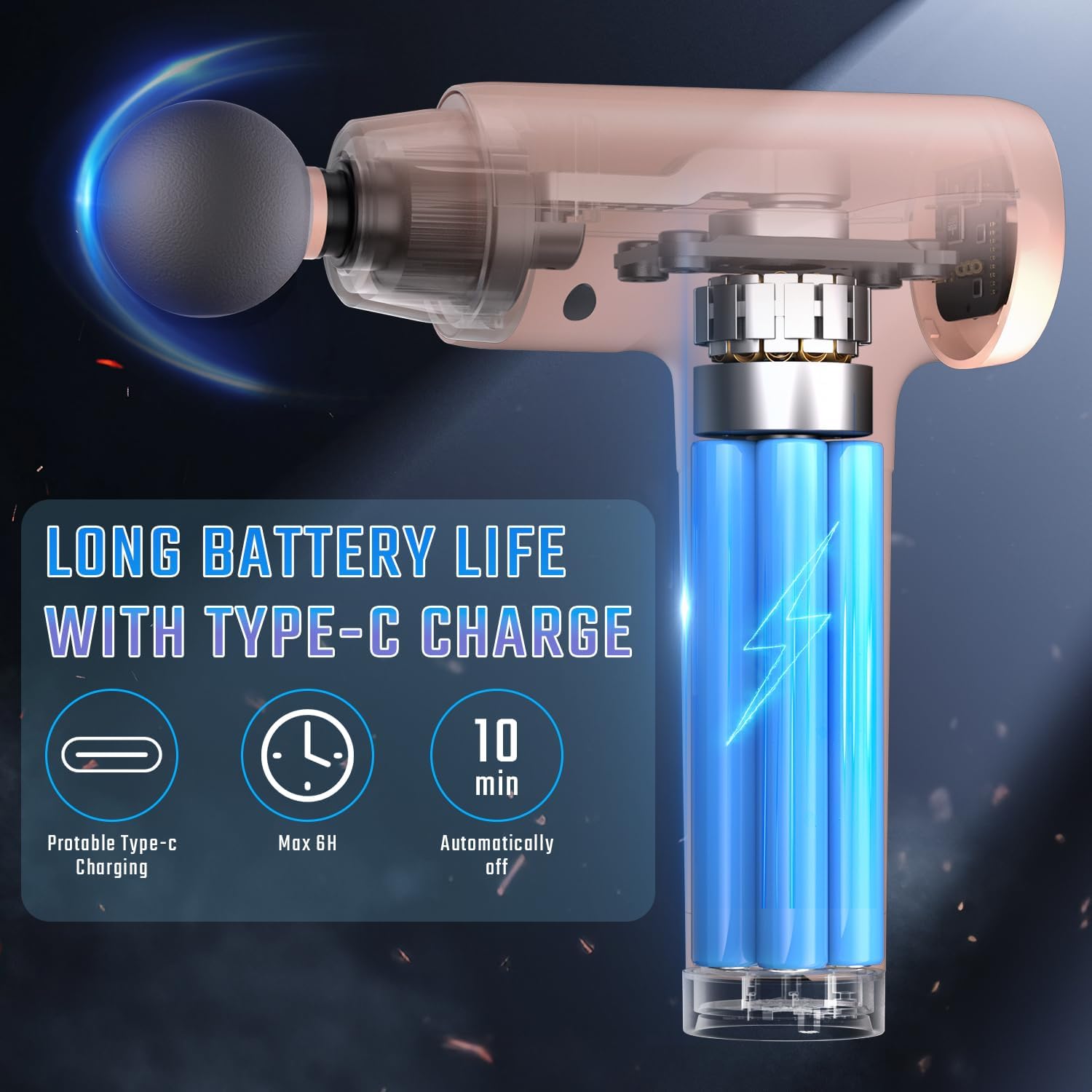 - 【USB Fast-Charging & Long-life Battery】 The deep tissue massage gun equipped with a 2000mAh Lithium battery, which can be continuously run for 6 hours through the brushless high-torque motor. The massager gun comes with a a USB Type C fast charging cable, so you can bring it and charge it anywhere.