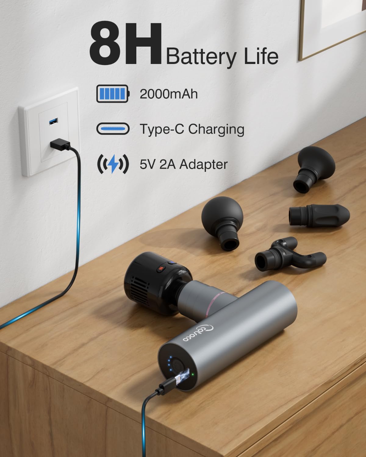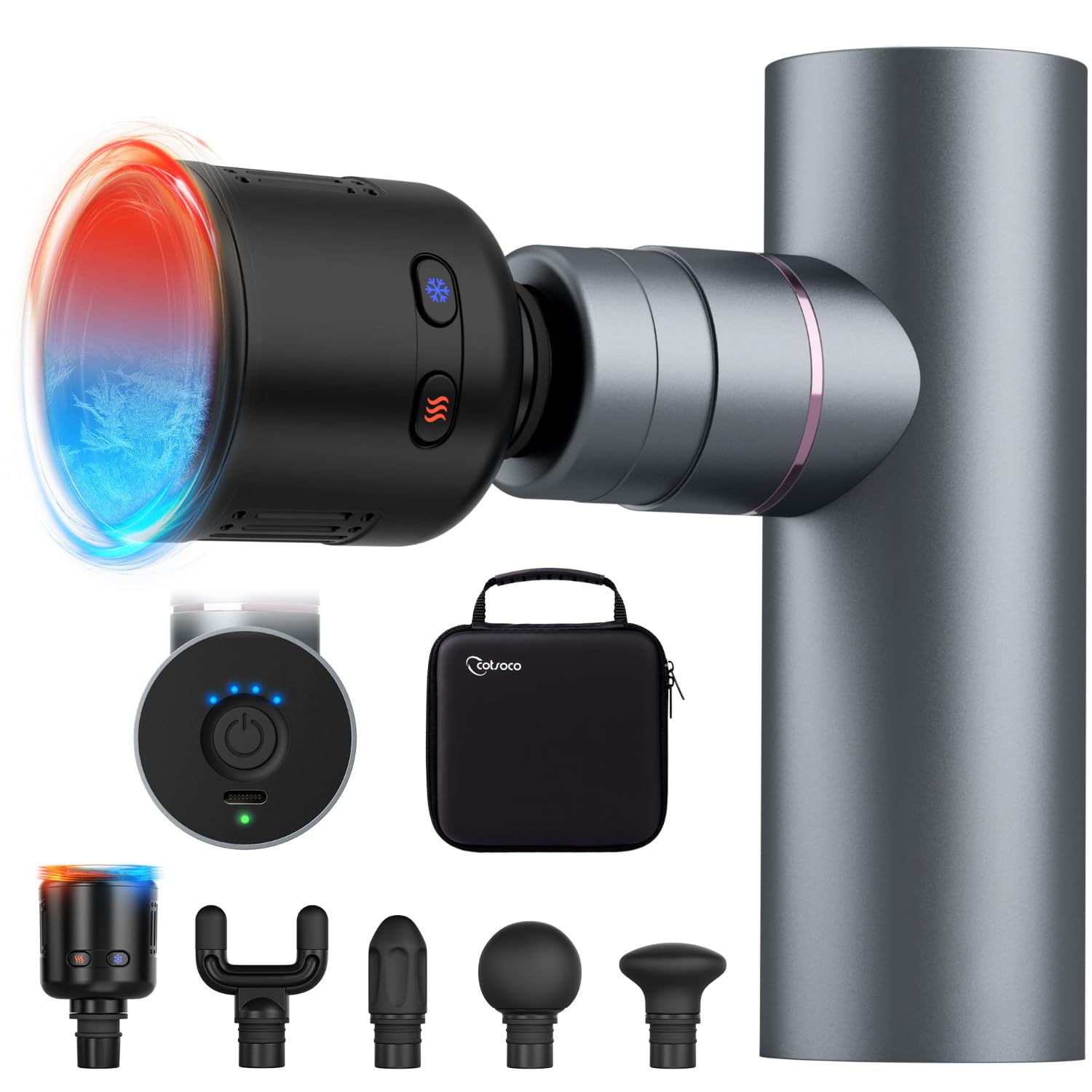 - Long Battery Life & Complete Accessories: Features a powerful rechargeable battery with 3-hour charging time and up to 8 hours of use. Operates quietly under 45dB, so you can enjoy a relaxing massage anytime. Includes a storage pouch, carrying case, and two Type-C charging cables (for the gun and the hot/cold head)