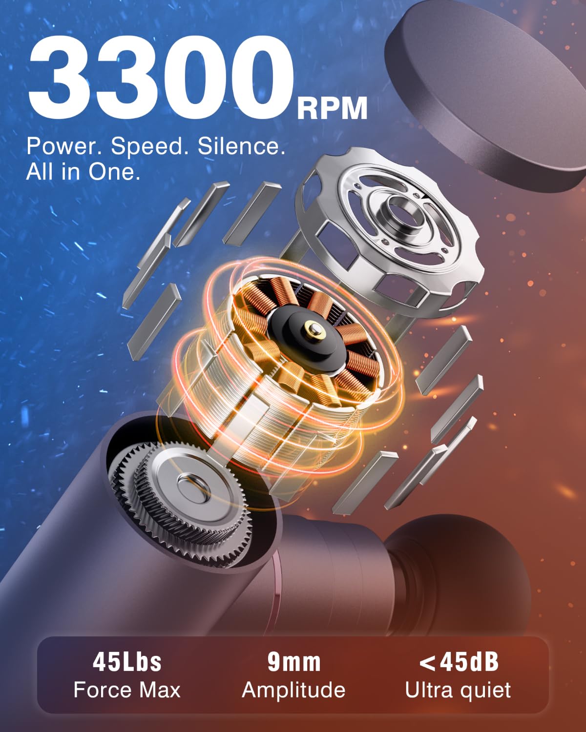 - 4 Adjustable Speeds with Strong Performance: Choose from 4 speed levels — 1600, 2200, 2700, and 3300 RPM — for precise intensity control. With 9mm amplitude and 45 lbs max force, it penetrates deep into muscle tissue for effective pain relief and faster recovery. Automatically shuts off after 10 minutes for safety and battery protection.